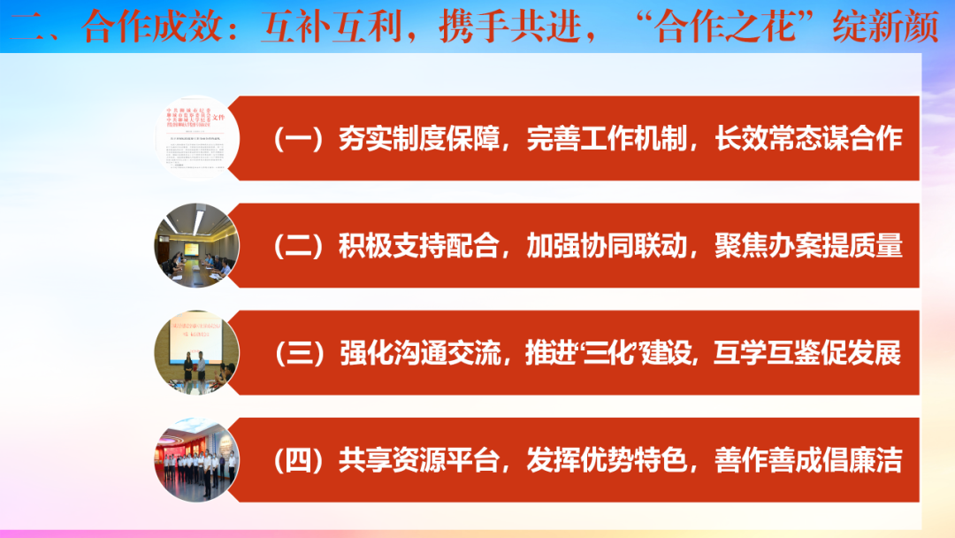 会议充分肯定了“室校地”协作所取得的成效。近年来,在省纪委监委第四监督检查室的指导下,公司纪检监察机构与聊城市纪委监委坚持“共融共进”,不断健全完善联席会议制度和日常工作联络机制;坚持“共联共建”,建立实战实训平台,推动纪检监察业务交流合作常态化;坚持“共研共享”,共同开展廉洁文化建设和廉政理论专项研究,有力促进了纪检监察工作质效提升。
