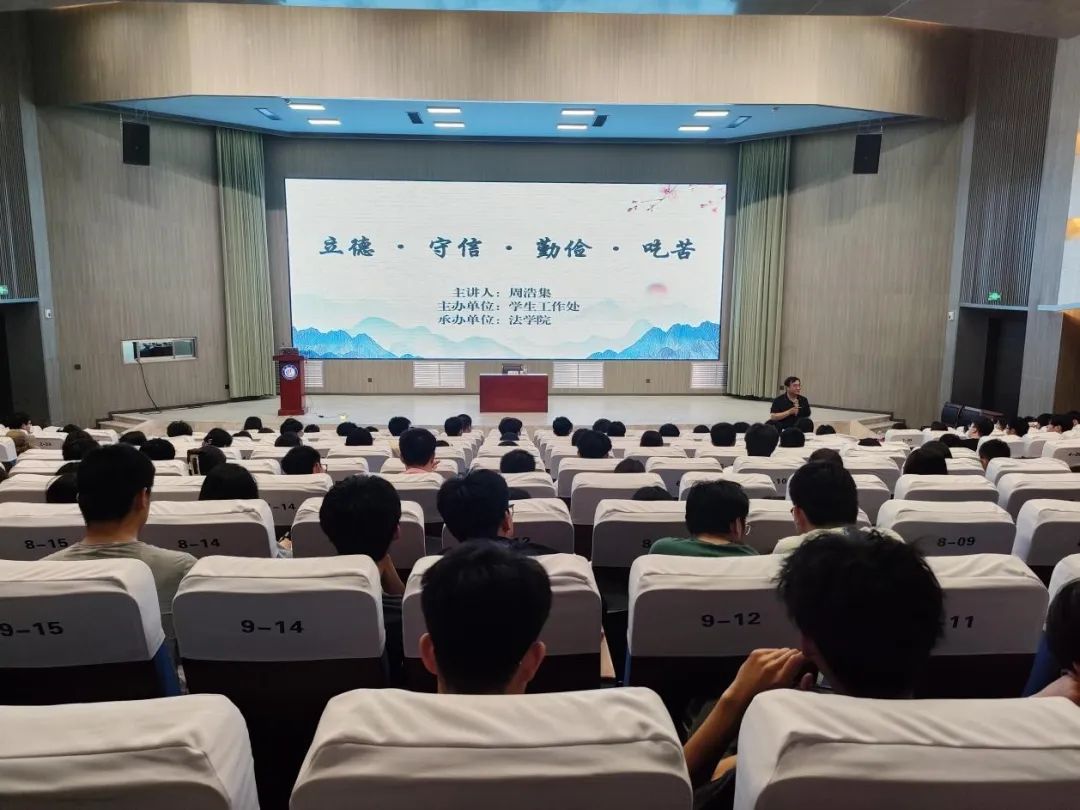 周浩集以“立德”两字为切入点,结合党的二十大报告中的相关内容,指出“立德”包括“明大德”“守公德”“严私德”三个方面,要“立德”就要坚定共产主义理想信念、牢记与践行为人民服务的宗旨、时刻严于律己。他援引了习近平总书记在党的二十大报告中对广大青年的勉励,那就是“广大青年坚定不移听党话、跟党走,怀抱梦想又脚踏实地,敢想敢为又善作善成,立志做有理想、敢担当、能吃苦、肯奋斗的新时代好青年,让青春在全面建设社会主义现代化国家的火热实践中绽放绚丽之花。”周浩集教授鼓励毕业生要坚定树立“四个自信”、降低物质欲望、提高精神境界,做到时刻警醒、防微杜渐、警钟长鸣。他还通过大量丰富详实的案例讲解了守信、勤俭和吃苦对成长成才的重要性,鼓励在场毕业生培养自律、自重的廉洁意识,树立爱岗敬业、廉洁从业的工作观念,树立正确的成才观、职业观、就业观,自觉把实现个人理想融入党和国家事业中去。