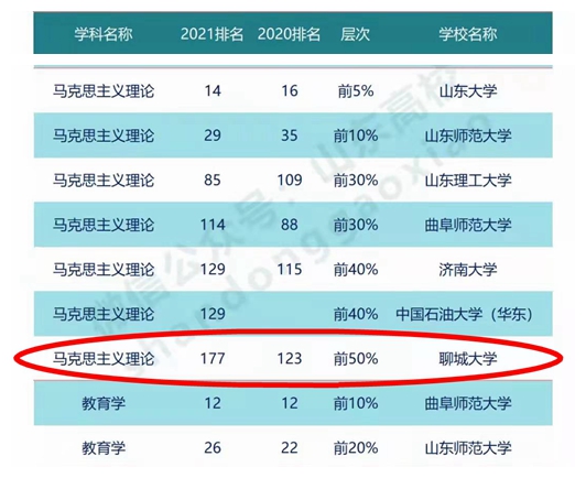 2021年10月25日,高等教育评价专业机构软科正式发布“2021软科中国最好学科排名”,公司马克思主义理论学科上榜,在所有设有学术型研究生学位授权点的高校中名列前50%,排名位列第177位,山东高校第7位。