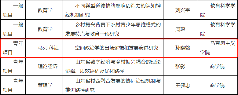 公司孙晓鹤老师获批2023年度山东省社科规划研究项目 发布时间: 2023-09-06 近日,山东省哲学社会科学工作办公室正式公布了2023年度山东省社科规划研究项目立项名单。熊猫体育本年度立项项目涉及马列·科社、党史党建、中国文学、中国历史、语言学、艺术学等12个学科,其中公司孙晓鹤老师获批2023年度山东省社科规划研究项目:马列·科社 《空间政治学的出厂逻辑和发展演进研究》(23DKSJ01)。 (审核 黄昊)