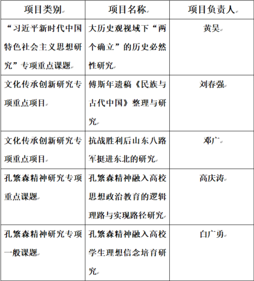 近日,聊城市哲学社会科学研究规划领导小组办公室公布《2023年度聊城市哲学社会科学规划课题立项公告》,公司5项课题予以立项,其中重点项目4项,一般项目1项。黄昊主持的《大历史观视域下“两个确立”的历史必然性研究》获批“习近平新时代中国特色社会主义思想研究”专项重点课题;刘春强主持的《傅斯年遗稿《民族与古代中国》整理与研究》、邓广主持的《抗战胜利后山东八路军挺进东北的研究》获批“文化传承创新研究”专项重点项目;高庆涛主持的《孔繁森精神融入高校思想政治教育的逻辑理路与实现路径研究》获批“孔繁森精神研究”专项重点课题;白广勇主持的《孔繁森精神融入高校员工理想信念培育研究》获批“孔繁森精神研究”专项一般课题。