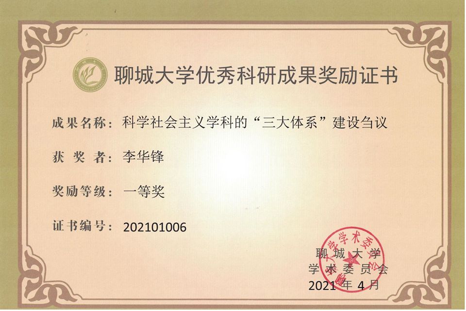 2021年度公司教师李华锋、刘春强、王红霞老师分别凭借论文《科学社会主义学科的“三大体系”建设刍议》、《“以考古经世”:唯物史观与历史语言研究所时期夏鼐的考古学研究》、《新发展理念方法论研究》斩获熊猫体育优秀科研成果一等奖。