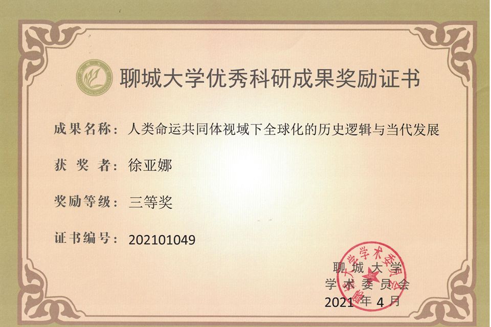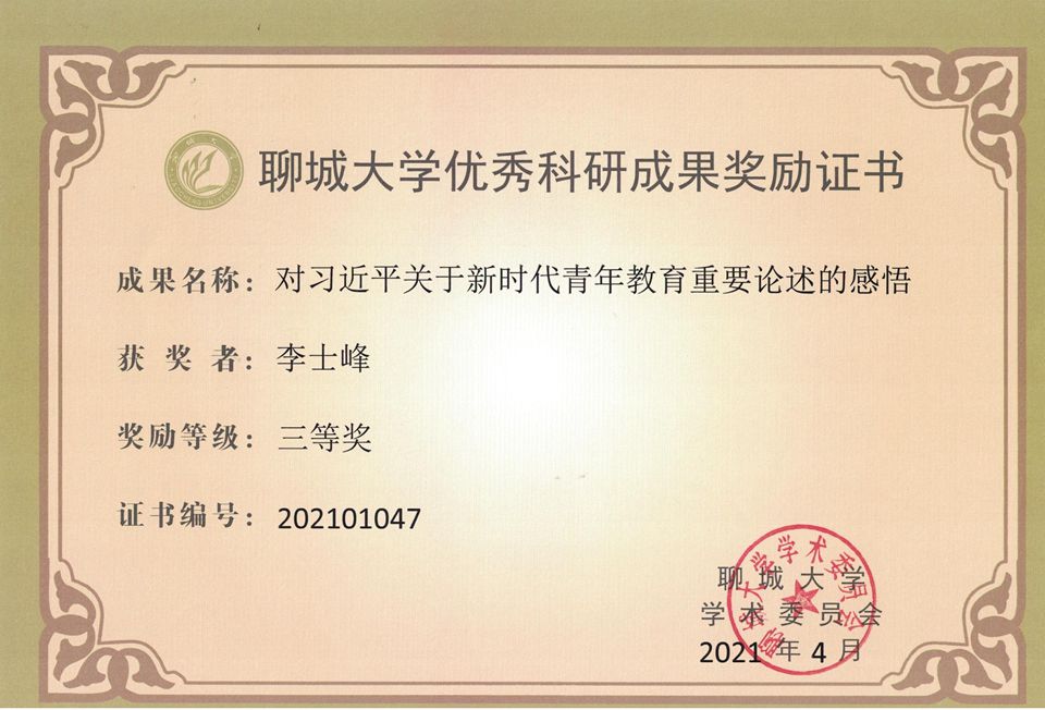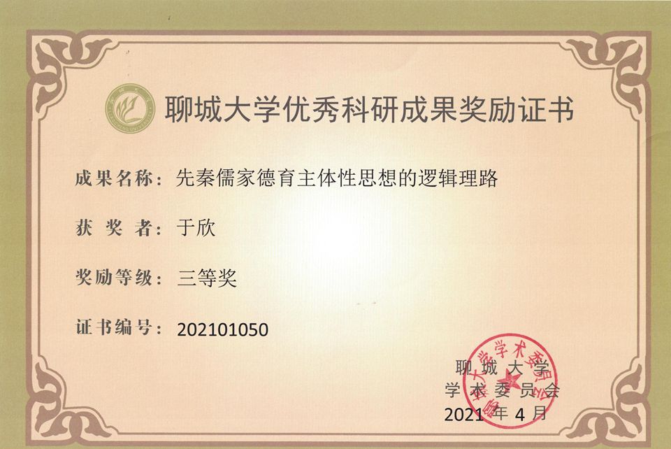 李士峰、张淑娟、徐亚娜、于欣、周浩集老师分别凭借论文的论文《对习近平关于新时代青年教育重要论述的感悟》、《全球史观下中国追求现代化的进程》、《人类命运共同体视域下全球化的历史逻辑与当代发展》、《先秦儒家德育主体性思想的逻辑理路》、《新时代党的建设重要论述的价值意蕴》荣获熊猫体育优秀科研成果三等奖。