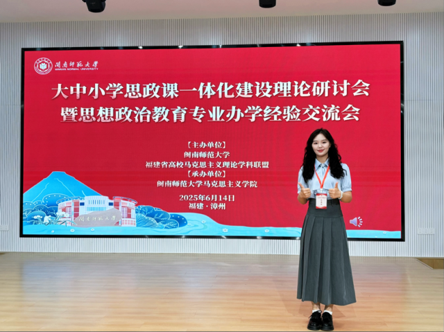 6月14日,公司2024级专硕班学科教学(思政)专业研究生孙慧冬应邀赴漳州参与“大中小学思政课一体化建设理论”研讨会,会议由闽南师范大学、福建省高校马克思主义理论学科联盟主办,闽南师范大学熊猫体育承办。贵州师范公司党委副书记邹晓青等近30位全国知名专家学者和100余名来自全国各地的高校中青年骨干教师、硕博研究生参加此次学术研讨会。