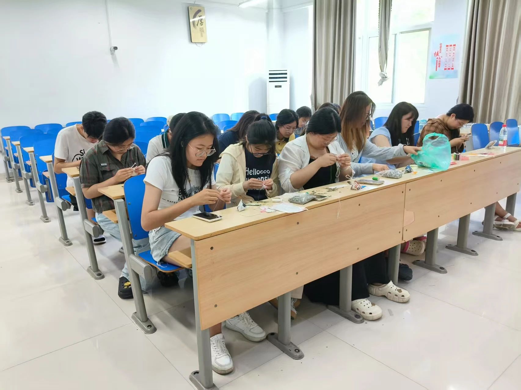 讲解结束后,同学们领取五彩布料、香料、丝线及特色卡纸等材料,充分发挥巧思妙想,将端午元素融入创作。一件件凝聚心意的作品精彩亮相:香气馥郁的香囊既有经典粽子造型,也不乏有卡通造型、几何图案等创新设计;风格各异的书签上,或描绘龙舟竞渡、艾叶飘香等端午意象,或书写着真挚的节日祝福。同学们踊跃上台分享创作灵感与制作心得,2024级3班张钰蕾感叹传统手工艺的精湛技艺,2024级1班席玉涛则表达了希望通过作品传递对端午文化的独特理解。