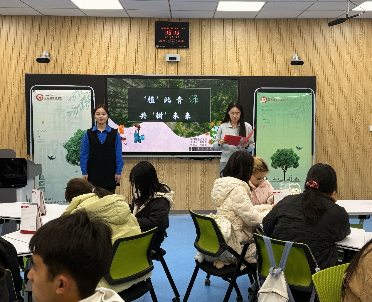孙慧冬以“植此青绿 共树未来”为题,借助一段段生动鲜活的视频和真实可感的案例,围绕根植历史、绿动青春、播种希望、共树未来四个部分详细讲述了植树节的历史由来、重要价值以及青年学子们投身植树节活动的重要意义。她指出,植树节的由来可回溯到1915年,那时我国首次设立“清明节植树”活动;到了1928年,为纪念孙中山先生逝世,植树节正式定于3月12日,这一决定不仅是对孙中山先生生前所倡导的“植树造林,绿化祖国”遗志的传承,更赋予了植树节深厚的历史底蕴与人文情怀。历经岁月变迁,植树节已成为了我国生态建设中重要的环保节日,承载着人们对绿色家园的美好期许。谈及植树节的重要价值,孙慧冬从生态、社会两个维度进行了细致的讲解。她指出,植树造林不仅能涵养水源、防风固沙;还能吸收二氧化碳,减缓温室效应,助力全球气候改善。此外,林业产业的蓬勃发展,还为社会创造了大量就业岗位,拉动了经济增长,推动绿水青山真正变成金山银山。活动最后她深情呼吁在场的青年学子们,增强社会责任感与环保意识,热爱自然亲近自然,积极投身植树造林活动,用实际行动为环保助力,为建设绿色中国贡献青春力量。
