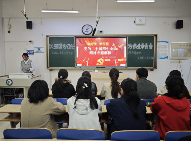本次活动采用“集中学习+交流分享”相结合的形式,助力青年群体统一思想、明确方向,为民族复兴凝聚青春力量。主讲人结合PPT演示与专题视频系统解读党的二十届四中全会精神,重点阐释“五个以”“两个推动”“一个确保”的要求与“六个坚持”原则,系统拆解科技自立自强、产业升级等全会核心任务,并引导青年思考自身在国家建设中的角色与责任。