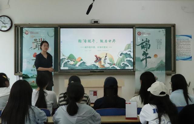 王顺以“‘粽’香端午,魅力中华”为题,立足传统文化传承、融合专业特色,围绕端午节的起源、习俗、相关诗词和知识竞赛四个方面展开生动讲述,带领同学们透过历史的烟云来感受端午的浓情与文化,进而领悟传统节日的文化内涵和当代价值,体会中华民族悠久的历史和丰厚的文化底蕴。她讲到,传统节日蕴藏着民族文化的集体意识,描绘着文化的共同底色,是推动中华优秀传统文化创造性转化、创新性发展的重要源泉,要不断挖掘端午节“文化富矿”,留住以爱国文化、民俗文化、健康文化等为代表的端午文化内涵,在传承端午文化中彰显其新的时代内涵和精神价值。