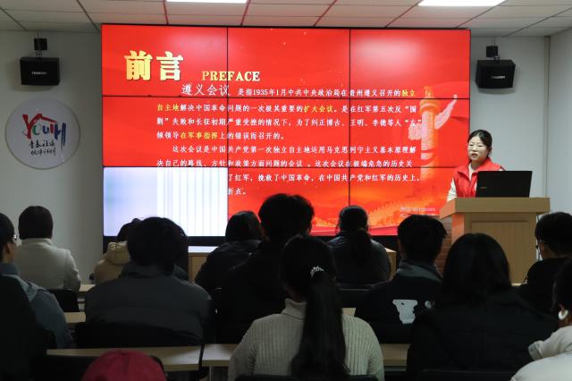 宣讲会在电影《遵义会议》的片段中拉开序幕,这部电影不仅唤起了大家对遵义会议历程的回忆,更寓意着在新时代背景下,青年学子应继承和发扬前辈们的奋斗精神。随后,宣讲团成员围绕遵义会议的历史背景、召开过程和决议内容、历史地位以及精神内涵四个环节系统剖析了遵义会议的重大意义,深刻诠释了遵义会议精神的核心要义。宣讲团成员指出,遵义会议是指在1935年1月中共中央政治局在贵州遵义召开的独立自主地解决中国革命问题的极其重要的扩大会议。这次会议强调一切从实际出发,尊重客观规律,实事求是地分析形势,制定正确的战略战术,标志着中国共产党开始独立自主地探索适合中国国情的革命道路。遵义会议在极端危险的时刻,挽救了红军和中国革命,是中国共产党历史上一个生死攸关的转折点,也为后来的中国革命、建设和改革提供了宝贵的思想财富。我们要运用好遵义会议历史经验,让遵义会议精神永放光芒。作为新时代的老员工,我们要传承和弘扬以“坚定信念、坚持真理、独立自主、团结统一”为基本内涵的遵义会议精神,不断铸牢信仰之基、补足精神之钙、把稳思想之舵,自觉做共产主义远大理想和中国特色社会主义共同理想的坚定信仰者、忠实实践者。