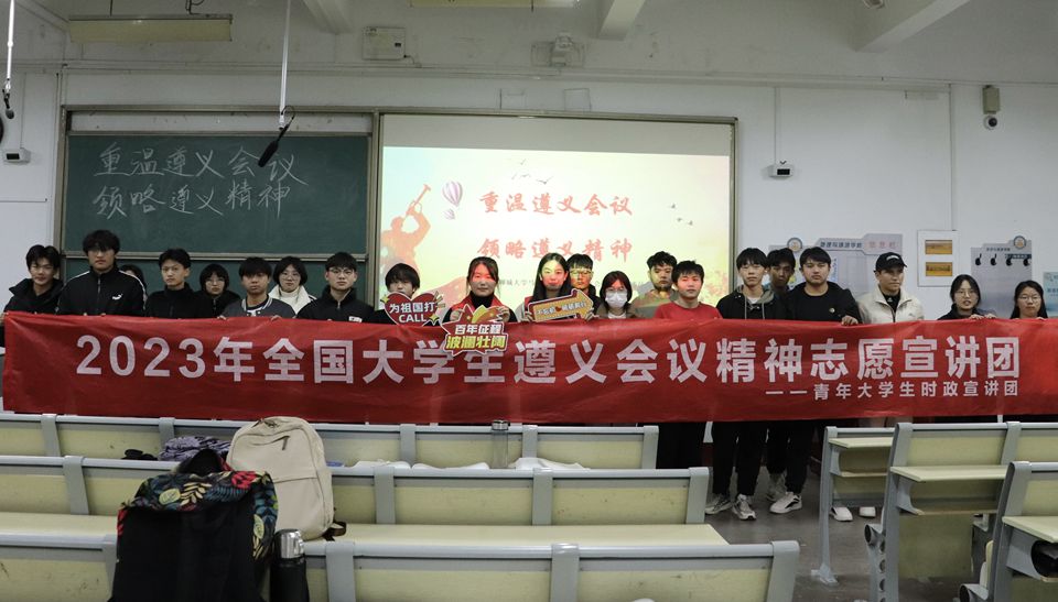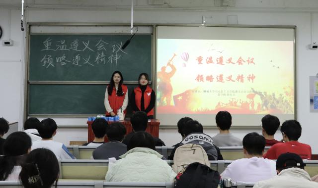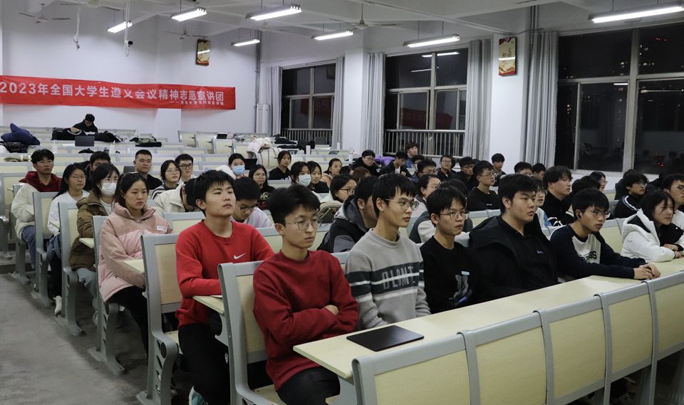 宣讲团成员以毛泽东在指导红军二渡赤水,再战遵义的途中所作的《忆秦娥·娄山关》引入宣讲主题,围绕遵义会议的背景、过程、历史地位和精神内涵四个方面展开系统论述,带领同学们深刻领会遵义会议精神的内涵和中国共产党实现伟大转折的“密码”,感受烽火岁月里革命先辈们的崇高品格和精神风范,为遵义会议精神之于当下的影响力写下生动的诠释和注脚。宣讲团成员讲到,心无信仰,何谈大国崛起,心无团结,何谈民族复兴。正是坚定信念、民主团结的遵义会议精神指引了中央红军一步一步走向胜利,指引了中华民族一步一步走向复兴。历史证明,遵义会议精神是中国共产党的宝贵精神财富,是中国革命、建设和改革的“内生动力”,为实现中华民族伟大复兴提供了强大精神动力,希望同学们都能追随遵义会议的历史足迹,迸发遵义精神的无限活力,进一步丰富遵义精神的时代内涵,从而补充新时代青年必不可少的精神钙质,恢弘老一辈革命家的凌云气势,在波谲云诡的时代棋局中找准位置,发挥个人价值。