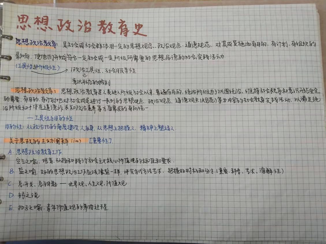 2020级10班李凯悦 《思想政治教育史》课堂笔记 一场突如其来的疫情破坏了平静的学习生活,我们被紧急通知上网课,网络教学是科技进步的实证,也是我们现如今的学习渠道。 公司餐厅的叔叔阿姨在为我们保驾护航,晚上打地铺,也要保障我们的生活,超市也引进了许多物资,还告诉我们不要担心,澡堂也正常开,老师也给我们上网课,让我体会到了公司陪我们一起努力,让我感到十分的感动,所以我们也要努力! 突如其来的网课学习也没有打破我的学习节奏,我很快适应了这种生活,老师认真负责,悉心教导,那我们也当好好学习,网课很考验我们的自制力,宋朝的朱熹曾言:“不奋发,则心日颓靡,不检束,则心日恣肆”。虽然我们在宿舍内学习,但是也要保持自律,跟随老师的脚步,专注于眼前的学习任务。 当阳光透过疫情的阴霾,心中的花迎着烈日而生,愿我们都能取得进步,早日到达遥远光明的未来!