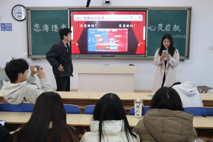 活动分为心理课堂和命题辩论赛两个环节,旨在帮助同学们增强心理认知与调适能力,从而在恋爱中实现自我成长。在心理课堂环节,主讲人围绕恋爱关系的建立、亲密关系中的心理现象、常见感情问题的应对等方面与同学们展开深度交流,引导大家剖析自身在恋爱中的行为模式与情感需求,帮助他们更好地理解爱情的本质。针对同学们在恋爱中的常见问题,主讲人列举了异地恋沟通不畅、信任危机等案例,并结合实际给出了可行的应对策略。他指出,有效的沟通是解决恋爱矛盾的关键,双方应学会倾听与表达,尊重并信任彼此。