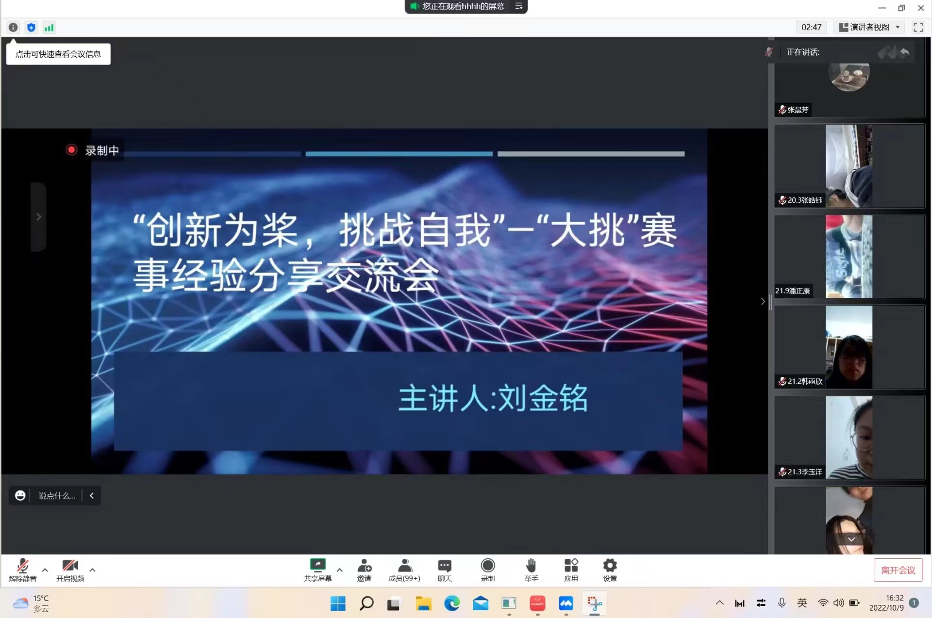本次活动采用线上方式进行。刘金铭就挑战杯赛事介绍、项目组织开展过程、收获与感悟三个方面,分享了其个人比赛过程及经验。刘金铭向同学们介绍了挑战杯作品分类及其评审侧重点,并从题目、前期工作、调查报告正文、调查设计及试验四个方面规范了调查报告的结构,着重介绍哲学社会科学类社会调查报告和学术论文的要求,详细介绍申报经验。她指出,选题是关键环节,一方面应结合自己的专业知识,另一方面应立足于现实社会发展要求。同时,刘金铭向大家分享参赛历程以及参赛问题,在任务分配方面,她指出应发挥每个成员的长处,增强团队合作意识在调查结果的分析和建议,注意分析的规范性以及建议的可行性、前瞻性。在交流会的最后,她鼓励青年员工放下思想包袱,勇敢尝试,积极参加科创竞赛,开阔视野,培养团队精神,奠定人生发展方向。