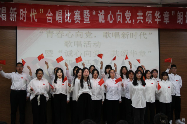 金秋难以用纸笔擘画,却被歌声朗诵声涂抹出鲜明色彩。参赛班级、评委及观众到场后,主持人致开幕词,在热烈的掌声中,比赛正式开始。首先一班同学以刚健自信,慷慨激昂的《有我》开场。红旗飘飘,歌声回荡,心中千般思绪、万种念想都汇聚成一腔热血。四班同学用《红旗飘飘》抒发对祖国的热爱之情,凭借动听歌声与道具配合赢得满座掌声。二班三班的曲目均为《我和我的祖国》,二班同学饱含深情,演唱悠扬婉转。铿锵有力、富有激情则是三班同学的鲜明特点,两班都展现出独具特色的风格。合唱比赛完成后,朗诵比赛拉开帷幕。四班同学凭借振奋人心的《少年中国说》及出众的表现,荣获一等奖。一班同学借《仰望党旗,向党致敬》呐喊青春誓言,以优异发挥斩获二等奖。二班同学以一篇《百年芳华》,生动展现我党之筚路蓝缕。三班同学带来压轴表演,直抒胸臆,字字铿锵,吟诵《祖国啊,我亲爱的祖国》,两班级均收获了三等奖。活动最后,主持人致闭幕词,各班负责人组织同学有序离场。