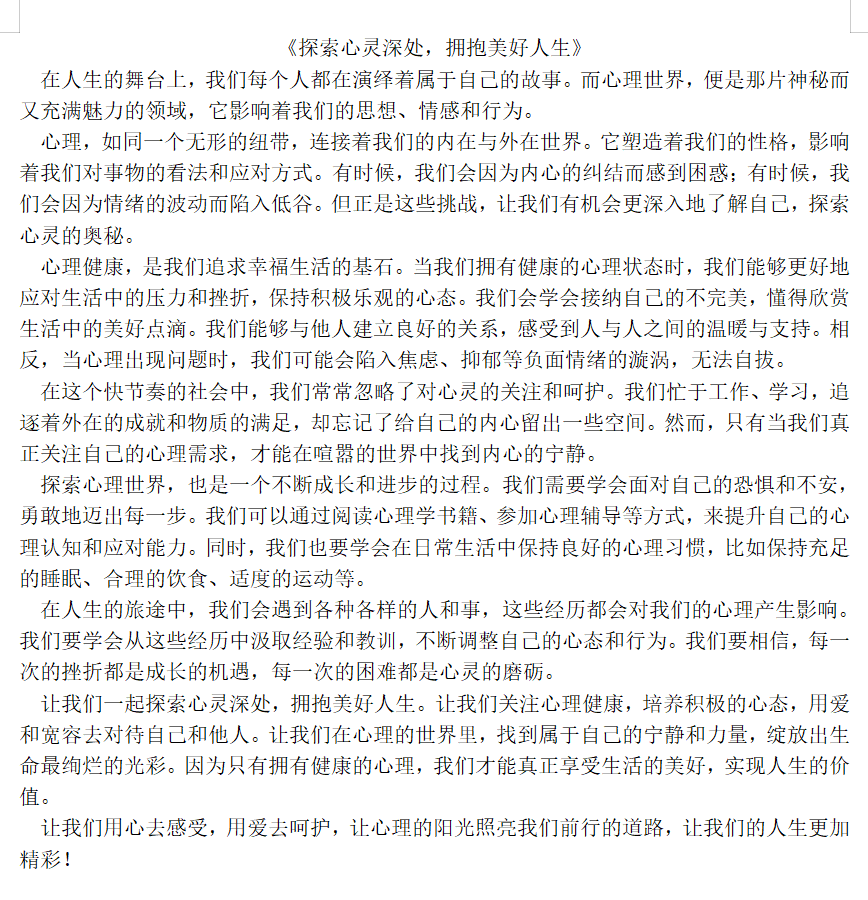 本次心理征文大赛活动,不仅有利于让同学们对心理健康有更深刻的认识,进一步激发同学们对心理健康问题的关注和思考,而且有利于推动公司心理工作健康发展,助力营造积极向上的公司氛围。