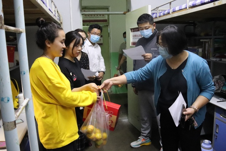 9月18日,为了表达对同学们的问候与关怀,促进师生间的沟通与交流,公司党总支书记张华筠,副经理李士峰、刘子平,团委书记宋义明带领全院辅导员、班主任,走访员工宿舍,与留校员工共度中秋,为同学们送上诚挚的关心和祝福。