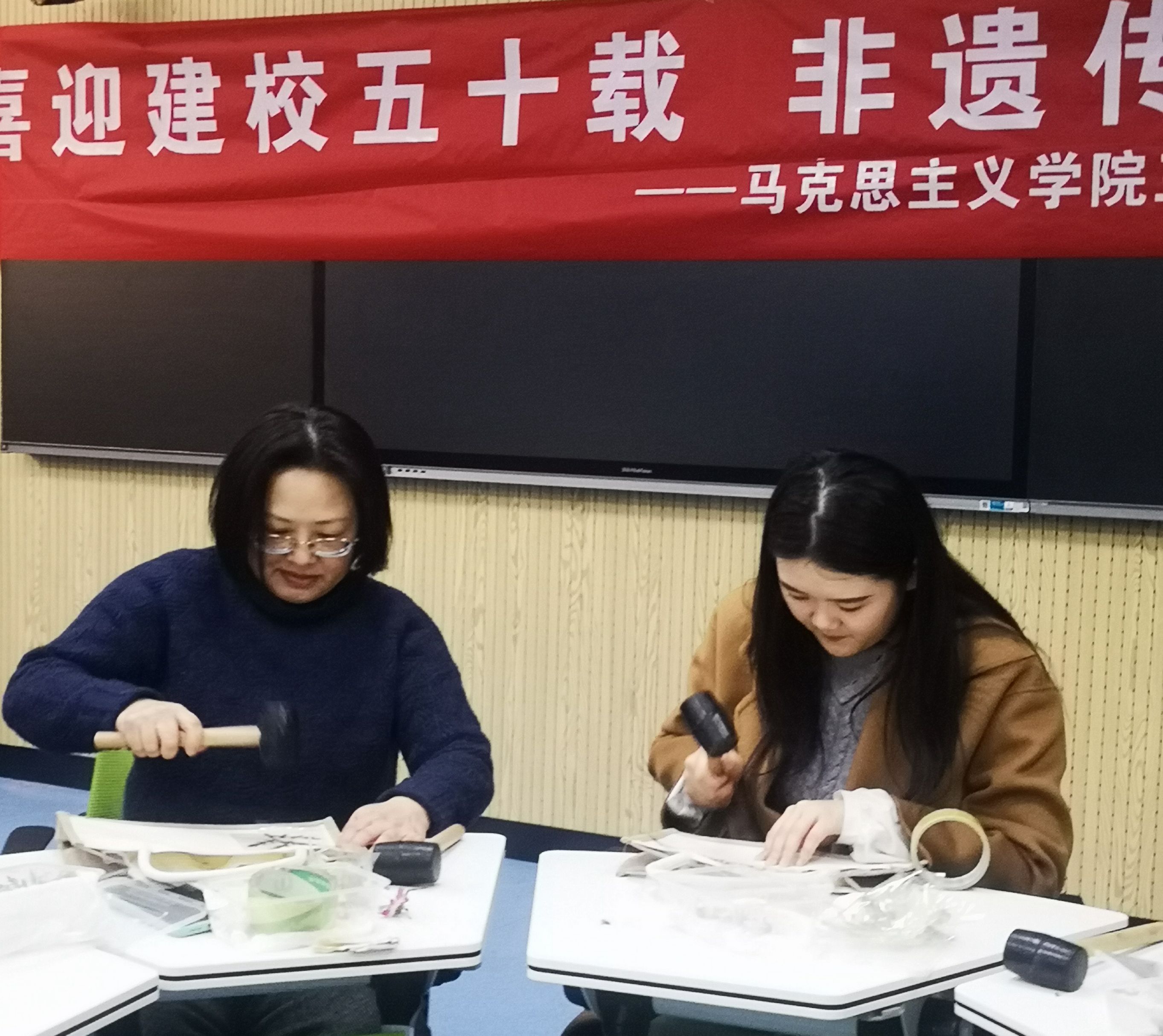 在拓染艺师的专业讲解和指导下,老师们纷纷化身为“巧手设计师”,通过别出心裁地修剪组合、色彩搭配,将不同的构思寓意融入到拓染实践中,一朵朵鲜艳的花朵,一片片绿意盎然的树叶,经过精心设计,在别出心裁的摆放和哐啷哐啷的敲打中,焕发出了别样的精彩。