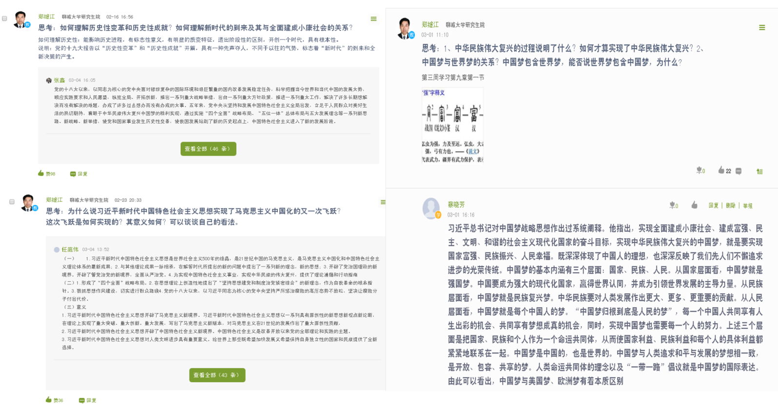 2019年3月18日,习近平总书记在公司思想政治理论课教师座谈会上提出,讲好新时代的思想政治理论课,必须做到“八个统一”:坚持政治性和学理性相统一,坚持价值性和知识性相统一,坚持建设性和批判性相统一,坚持理论性和实践性相统一,坚持统一性和多样性相统一,坚持主导性和主体性相统一,坚持灌输性和启发性相统一,坚持显性教育和隐性教育相统一。这“八个统一”是对思政课建设长期以来形成的规律性认识和成功经验的科学概括,是新时代思政课改革创新的根本遵循。概论课教师采取网络慕课资源与自建课程相结合的方式,大大丰富了教学内容,探索深化党的理论教育、信念教育、生命教育、科学教育。同时鼓励教师结合自己的优势就相关专题做精、做深,推动形成疫情防控思想政治教育的正向社会效应。打造有思想、有深度的概论网课,针对疫情的特殊情况,充分发挥概论课的与实际紧密结合的优势,让员工洞察“说法”背后所蕴含的“想法”和“方法”,领会“道理”之中所蕴含的“真理”和“情理”。