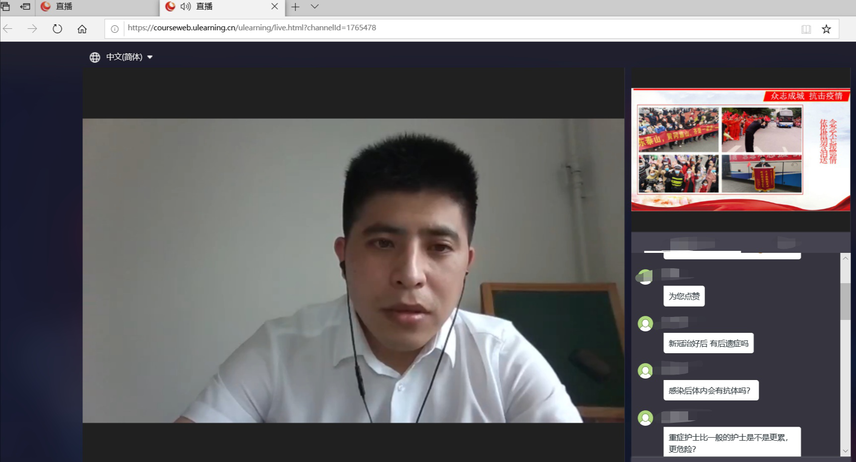 5月29日,公司组织了一场别开生面的思政“云”课堂,此次活动邀请的嘉宾是聊城市人民医院重症医学科的一名护士,他叫田龙营。现任重症医学科气道管理亚专业护士长,山东省抗击新冠肺炎疫情典型事迹宣讲报告团成员,第24届“山东青年五四奖章”获得者。荣获“黄冈荣誉市民”“山东省最美护士”“援鄂抗疫最美逆行者”等荣誉称号。他透过屏幕分享了自己的抗疫故事,并与公司近百名师生“隔屏”互动。