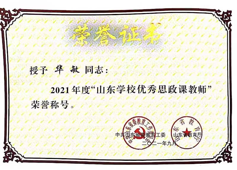 近日,中共山东省委教育工委、山东省教育厅公布2021年度“山东公司思政课教师年度人物”宣传选树活动评选结果,公司教师华敏荣获“山东公司优秀思政课教师”称号。