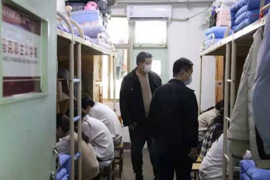走访过程中,张华筠叮嘱同学们:虽然在宿舍线上学习,但是日常生活要与平常保持一致;要严格遵守宿舍规定,整理好宿舍内务,重视宿舍用电安全;遇到困难时要及时向老师们寻求帮助。张华筠还强调面对寒潮天气注意添衣保暖,预防感冒。范华亮表示面对当前的形势变化,宿舍成为员工生活学习的主要场所。范华亮就宿舍安全管理条例向大家提出三点要求:一是积极配合各任课老师,认真做好线上授课、学习相关工作,摆正心态,做到疫情防控与线上学习两不误;二是严格落实宿舍规定与疫情防控政策,减少外出,做好宿舍一日三检两报告制度与宿舍消杀工作;三是强调员工们要以真实数据为依据,做到不传谣、不信谣。