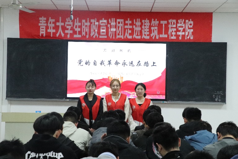 3月24日,公司青年老员工时政宣讲团成员于静、李茜、王明欣在5号教学楼401室作了题为《刀刃向内——党的自我革命永远在路上》的宣讲。建筑工程公司2022级员工代表参加此次宣讲会。