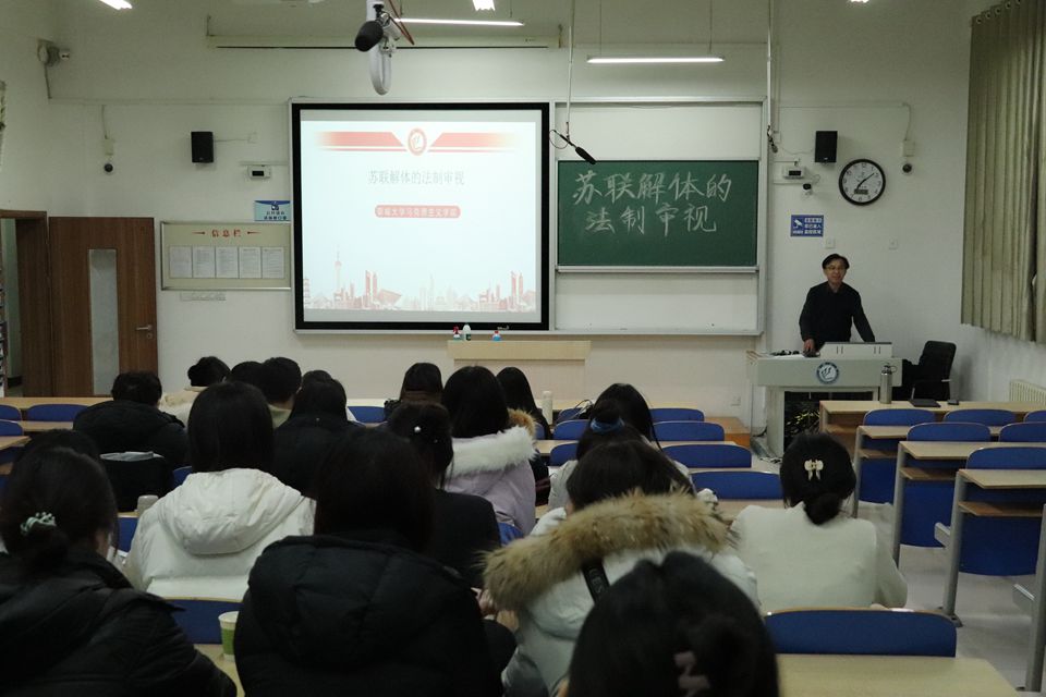张有军老师以“法制在国家治理中的重要意义”作为切入点,并以时间为序,围绕1924年苏联宪法的制定、斯大林至勃列日涅夫时期法制建设的失误、戈尔巴乔夫时期法制建设的失误三个维度,深入浅出地剖析了苏联解体的法制层面因素。他谈到,前车之覆,后车之鉴,并从加强法制建设、疏通法治化轨道、培养公民法治意识等方面,条理清晰地总结了苏联法制建设失误留给我们的教训。