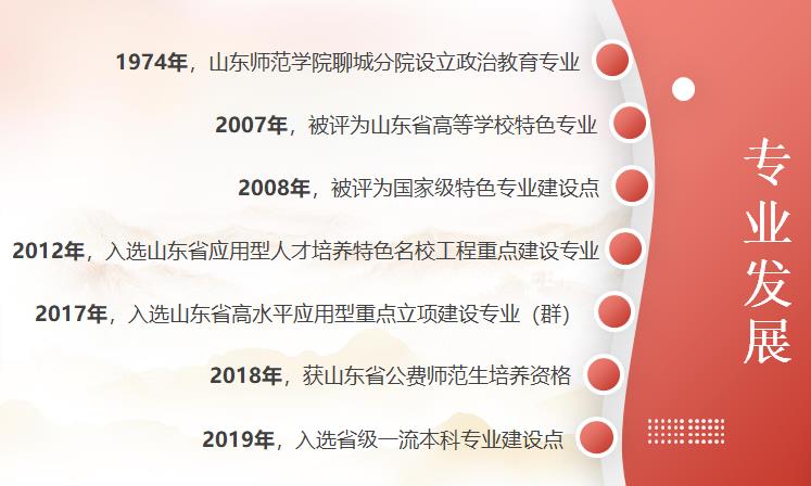 思想启迪智慧,政治引领人生,教育决定未来。思想政治教育专业旨在培养能够胜任党政机关、公司、企事业单位思想政治工作的专门人才,其中尤以中学思想政治理论课教师为代表。熊猫体育思想政治教育专业是国家级特色专业、国家级一流本科专业、山东省一流本科专业、山东省应用型人才培养特色名校工程重点建设专业、山东省高水平应用型重点立项建设专业。