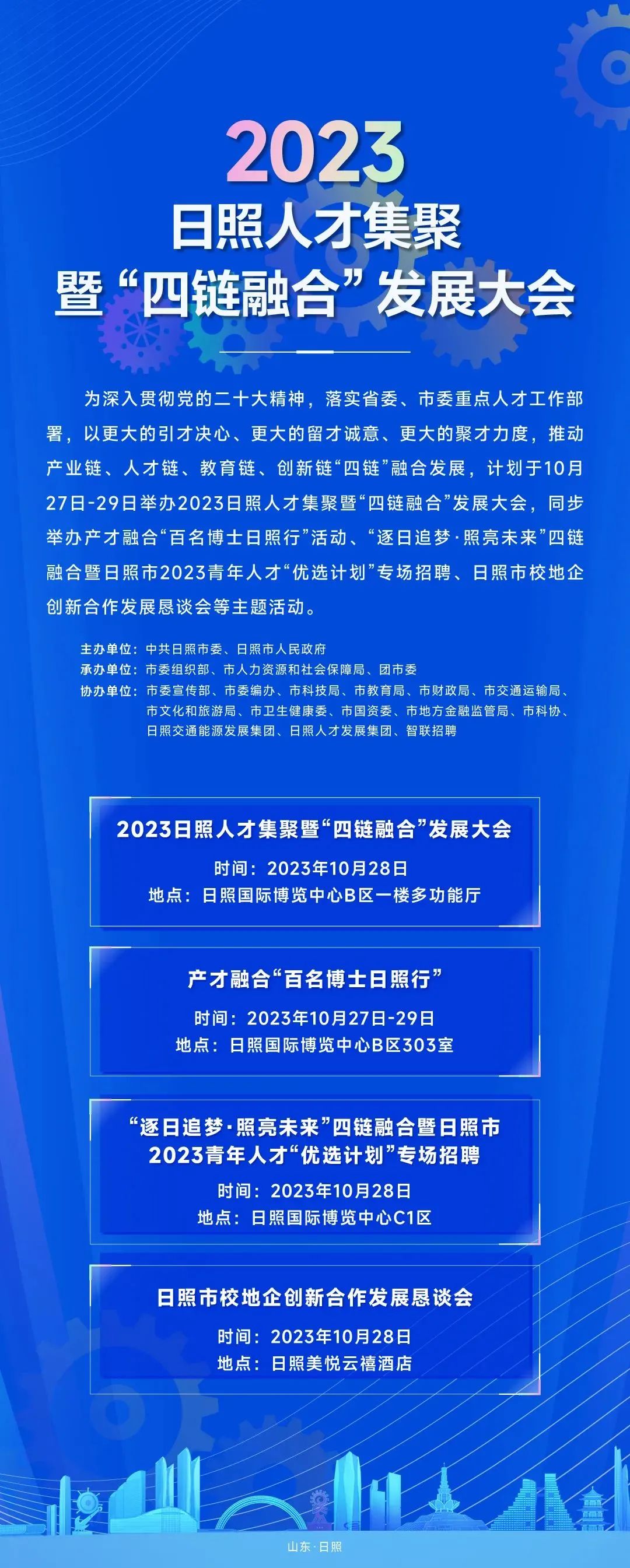 为深入贯彻党的二十大精神,落实省委、市委重点人才工作部署,以更大的引才决心、更大的留才诚意、更大的聚才力度,推动产业链、人才链、教育链、创新链“四链”融合发展,打响日照特色人才品牌,提升日照人才工作影响力,定于10月28日举办“逐日追梦•照亮未来”四链融合暨日照市2023青年人才“优选计划”专场招聘活动。现将有关内容公告如下: